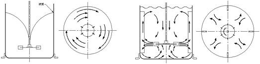 A. For a center insertion operates in low viscosity without any baffles to block the flow, the fluid will generate swirl (Figure D), where the higher the mixing speed, the more severe the swirl. Such mixing efficiency will be the lowest and can be eliminated by adding baffles (Figure E). Add 4 vertical standard baffle sets in a vertical tank, where the width of the baffle is around 1/10~1/12 of the tank diameter. It is found that further increase in width of the baffle will not improve the driving force. Therefore, from the viewpoint of power consumption of the blades, this width value cannot be regarded as a standard baffle width. As found in the experiment that the range of baffle width will help the fluid mixing in between the top and bottom portions and eliminated eddies. However, if the number of baffles increases, the power consumption will increase. When the fluid viscosity increases, the need of the baffles decreases and the baffle width as well. The baffle could keep an appropriate clearance to the tank wall for the fluid to flow through and avoid stagnation. For the fluid of higher viscosity, slanting installation can be applied.